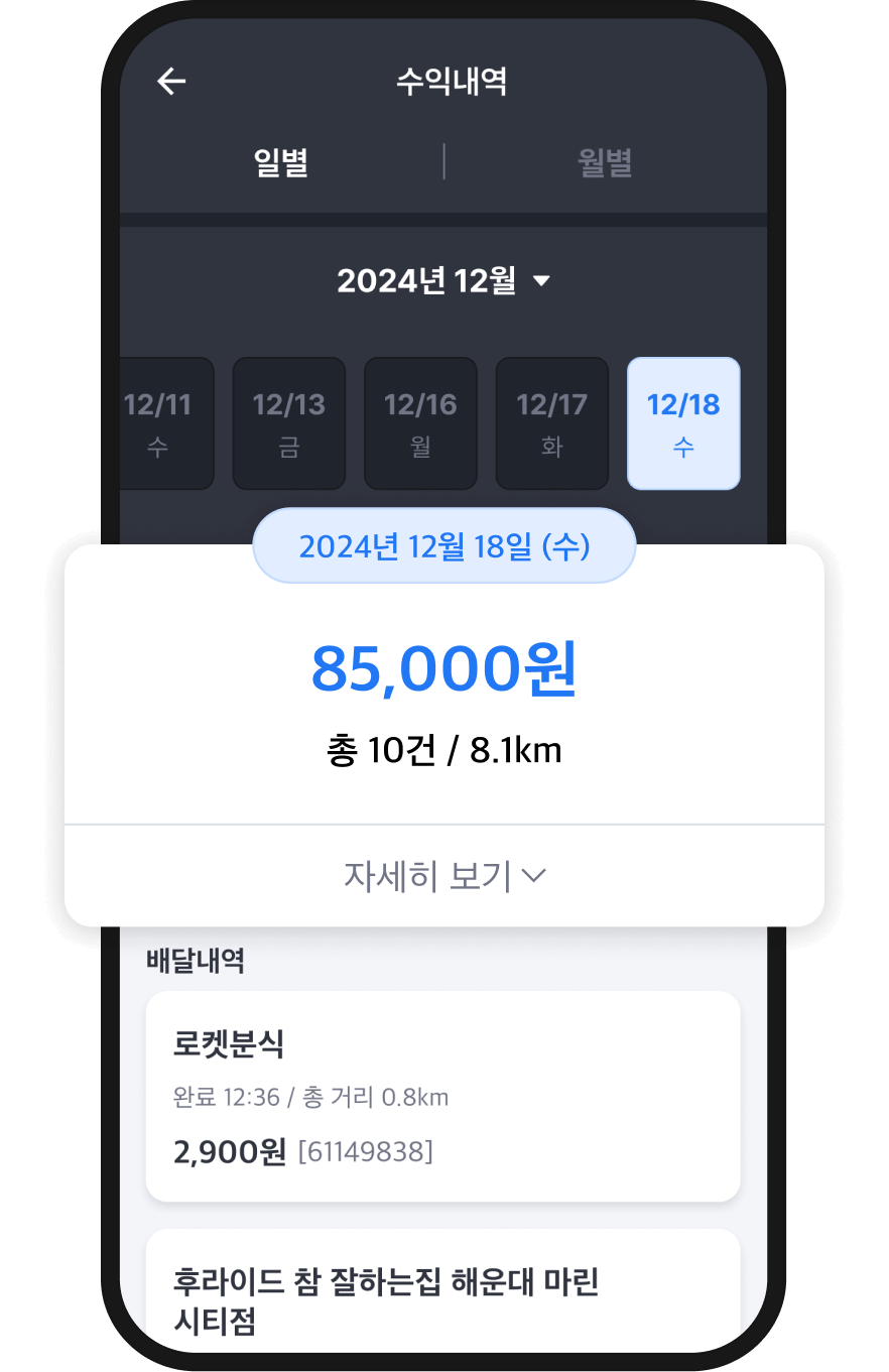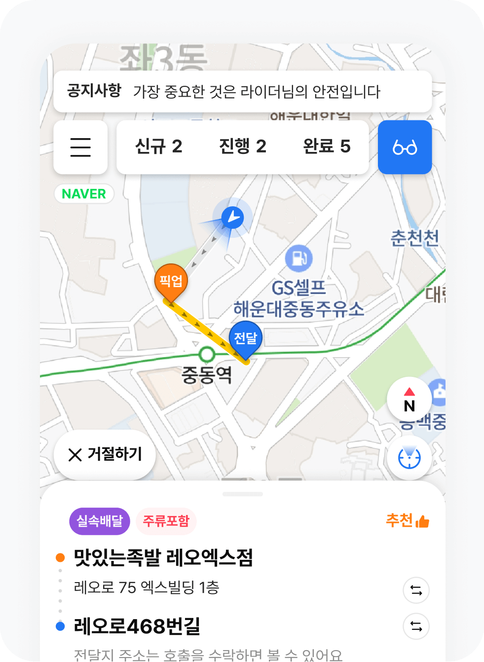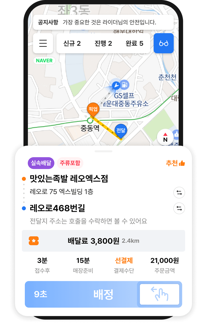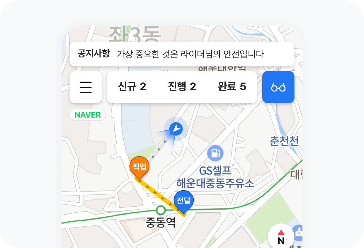 지도에서 바로 배차 받고 첫 배달을 출발해 보세요.